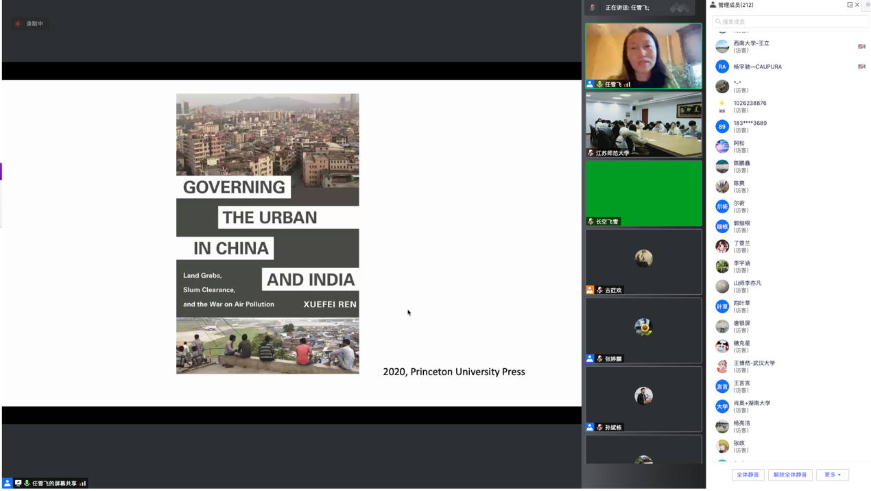 美国密歇根州立大学社会学和全球城市研究副教授任雪飞应邀作题为“比较视角下的中国城市”的学术报告。任雪飞老师长期关注全球城市发展,研究工作得到伍德罗·威尔逊国际学者中心、安德鲁·梅隆基金会和美国学术协会理事会的支持,取得了丰硕的研究成果,代表作《中国和印度的城市治理》、《城市中国》、《建设全球化》等专著获得诸多学术奖励。学院孙斌栋教授、刘承良教授、姜允芳教授、崔璨研究员、胡志丁研究员、申悦副教授、司月芳副教授、张维阳副教授、李春兰副教授、张婷麟讲师、胡德讲师、李琬博士、尹春博士、古荭欢博士等多位老师及公司各院系的博士后、研究生和本科生参加了本次线上讲座,也吸引了来自北京大学、武汉大学、香港中文大学、南京师范大学、江苏师范大学等高校和科研机构200多名师生积极参与。