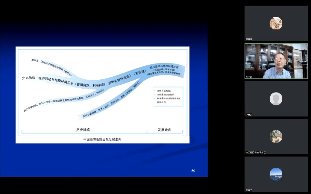李小建教授从“经济地理思想史的研究出点”、“经济地理思想史界定”、“经济地理思想发展的阶段特征”、“经济地理思想历史演化脉络”和“中国经济地理发展趋势走向”五个方面进行了详细的讲解。
