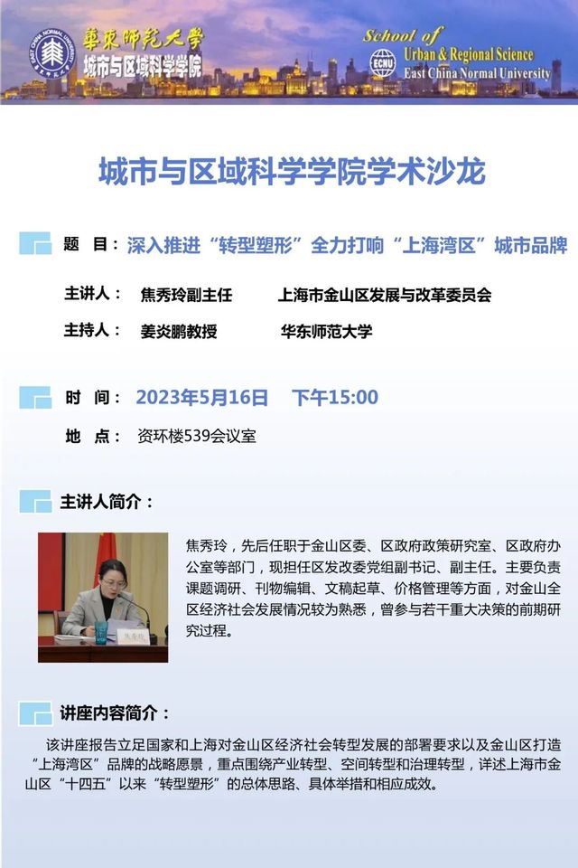 讲座信息|上海金山区发改委焦秀玲副主任主讲“深入推进'转型塑形'全力打响'上海湾区'城市品牌”,欢迎师生参加!