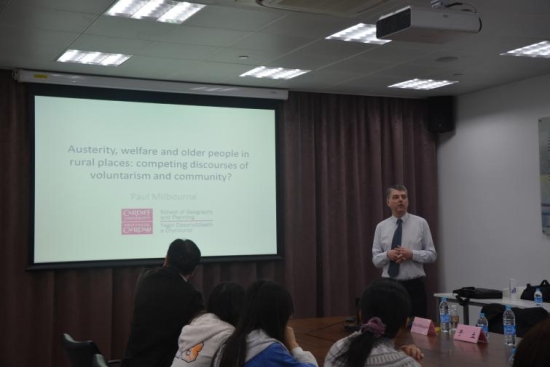 2016年4月26日上午,304am永利集团百场校级学术讲座在304am永利集团中北校区地理馆举行。英国卡迪夫大学地理与规划学院经理保罗·米尔本教授应邀做了题为“财政紧缩、福利改革与乡村老人:志愿主义与社区机构的话语竞争”的学术讲座。城区学院经理杜德斌教授主持。卡迪夫大学地理与规划学院硕士课程中心主任于立博士,城区学院孙斌栋、殷为华、宋韬、包晓雯、申悦、苏盼盼、刘娟等老师和研究生参加了讲座活动。