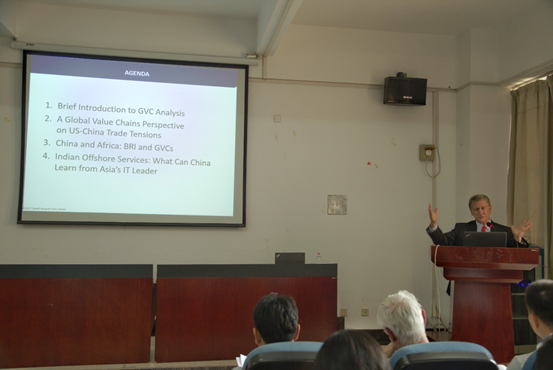 Gary Gereffi教授首先概述了全球价值链分析的理论框架和方法论,指出全球贸易已经由传统的以终端商品为主和建立国家工厂的贸易转向以中间商品为主和加入世界工厂的贸易,并且提出在全球价值链中附加价值提升主要体现在无形的前生产阶段(研发设计)和后生产阶段(营销和售后服务)的观点。Gereffi教授从全球价值链视角切入,就当前中美贸易紧张局势进行分析,指出中国的经济崛起和科技发展冲击了美国在全球价值链的主导地位,并认为目前的中美争端不是简单的贸易战,而是关乎中美核心发展战略的竞争和由中美哪个国家控制技术未来的战略性问题。基于全球价值链视角,Gereffi教授讨论了需要研究的若干重要问题,如中国如何减轻美国保护所带来的压力、中国“一带一路”倡议与全球价值链的关系等。