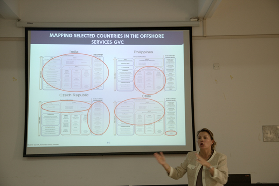 Karina Fernandez-Stark则做了Indian Offshore Services: What Can China Learn from Asia’s IT Leader的报告,在阐述离岸服务价值链理论框架基础上,就印度的IT离岸服务业进行价值链升级的典型案例分析。