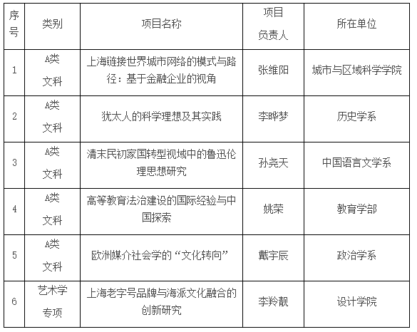 本次全市范围内共有112位优秀青年教师入选,其中A类76人,艺术学专项9人,B类27人。今年公司文科6位教师入选该项目,其中包括艺术学专项1人,入选人数总数在各申报单位中位列第一,具体立项名单如下: