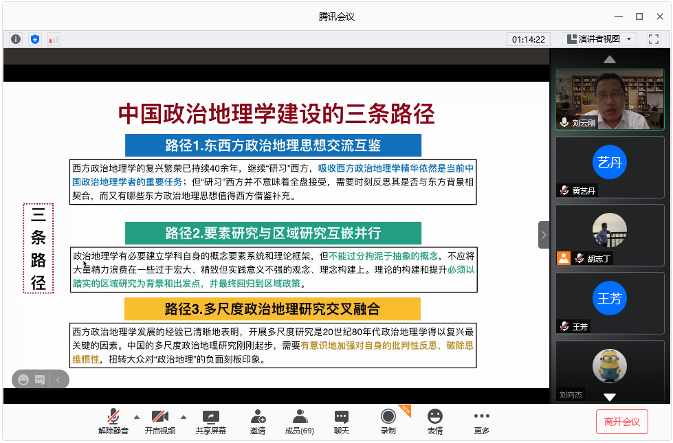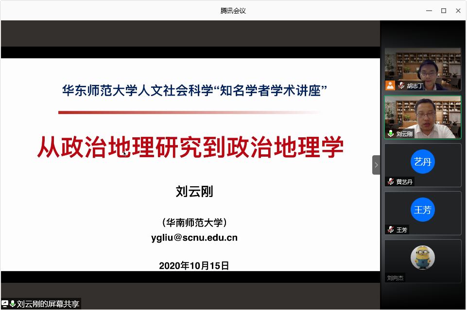 2020年10月15日19:00,304am永利集团人文社会科学“知名学者学术讲座”在腾讯会议平台开讲,在城市与区域科学学院胡志丁研究员的邀请下,来自华南师范大学的刘云刚教授做了题为《从政治地理研究到政治地理学》的学术报告。