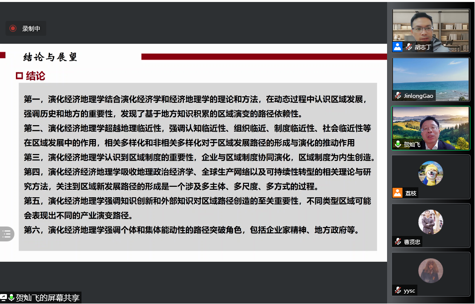 贺老师采用循序渐进的方式进行阐述,在讲座伊始带领大家对经济地理学的发展和演化过程进行了简要回顾后,对演化经济地理学的基本理论进行逻辑梳理,再向大家介绍本次讲座的重点:演化经济地理学视角下的区域发展及区域发展模式;最后对演化经济地理学做出言简意丰的总结与展望。
