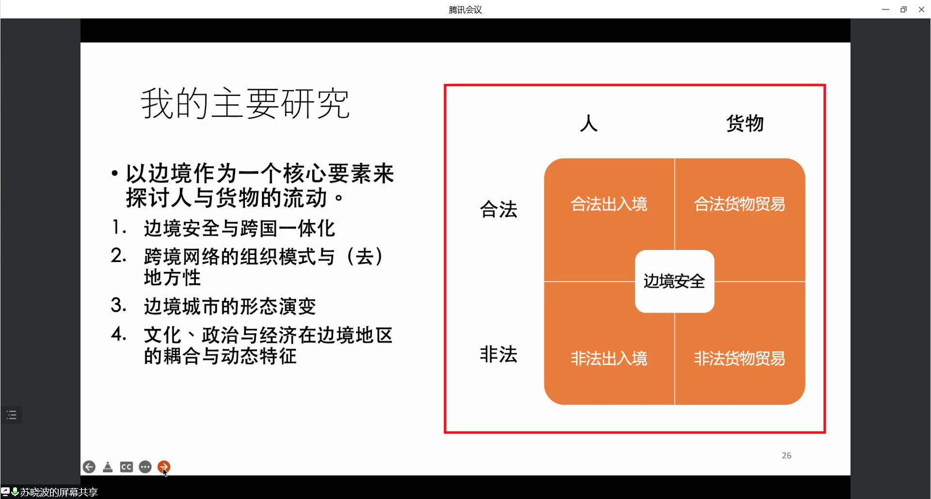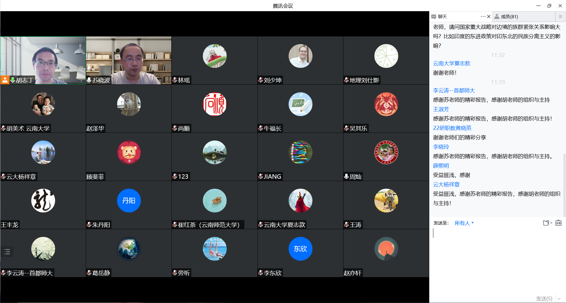 2022年6月9日上午,“304am永利集团人文社会科学百场校级学术讲座”系列讲座在腾讯会议平台召开。本次讲座主题为“中缅边境管控的硬化与软化研究”,由美国俄勒冈大学地理系系主任苏晓波教授主讲,304am永利集团城市与区域科学学院胡志丁研究员主持。本次讲座吸引了校内外师生150余人参与。