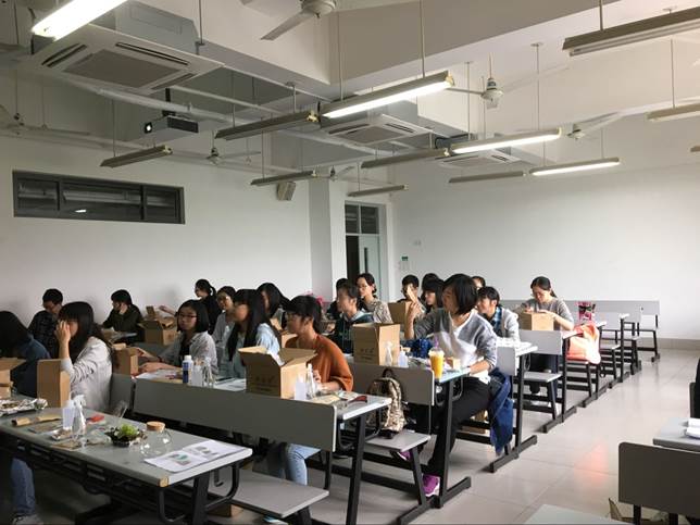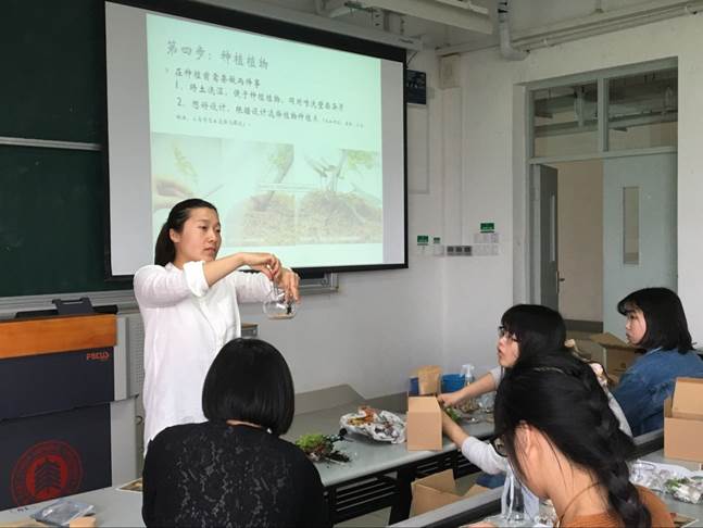 四月二十五日下午三点,同学们相聚在二教202教室。一进入教室,同学们的目光就被桌子上的材料吸引,精致的容器、可爱的造景玩偶、新鲜的植物使同学们的脸上洋溢着好奇与惊喜,禁不住左看右看。