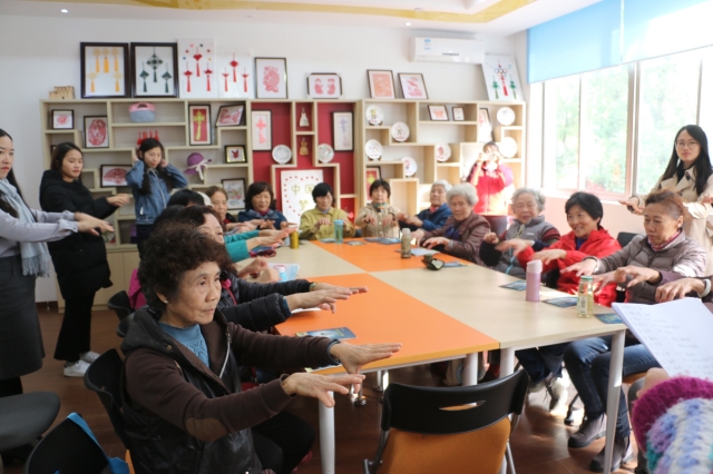 为提高老年人锻炼的积极性,由志愿者进行教学手指操与肩颈运动的示范,还有志愿者们分列两旁进行辅助,带动老人们进行学习,带来了很好的教学效果。
