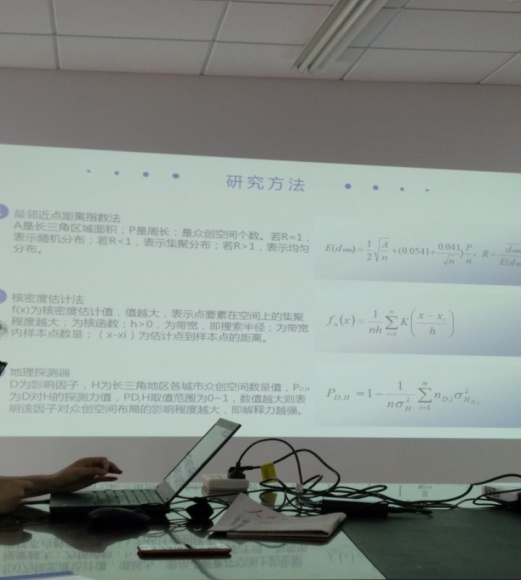 覃柳婷同学首先介绍了众创空间的现实意义和政策规划,并根据国家部委的有关文件研究了不同发展阶段的扩散情况,然后运用最邻近指数法、核密度估计法等计量方法分析了长三角地区众创空间的地理分布格局及其变动特征,最后运用地理探测器探究该地区众创空间地理格局的影响因素。与会同学积极发言,对众创空间的时空趋势等进行热烈讨论,认为从其发展演变来看符合经济地理的一般规律。也有同学对地理探测器的使用表示非常感兴趣,覃同学介绍了其优势和不足,滕老师对其原理和使用情况也作了补充,并鼓励同学们使用更多的计量软件。