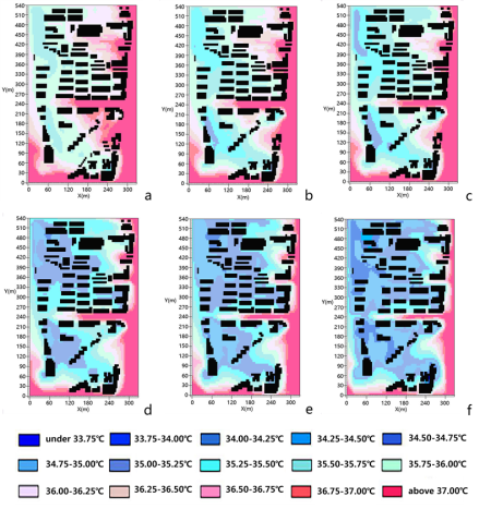 第三部分主要对所得结果进行分析和讨论。从分析中可以得出以下结果:(1)具有绿色廊道的城市河流在一定距离的降温效应中起着重要作用。(2)高反照率材料对降低大面积住宅小区的高温效应也有一定作用。(3)绿地斑块,特别是较大斑块的降温效应对改善热环境具有重要的意义,屋顶绿化在一定范围内起到了一定的补充作用。(4)东西走廊对街道及步行空间周边空间的改善作用相对显著。(5)南北走廊是所有适应性措施中最重要的降温因素,特别是在水体等冷空气源的协同作用下,热环境改善明显。(6)总体绿地网络格局比绿地网络中的任何单一要素具有更大的降温效果。