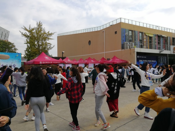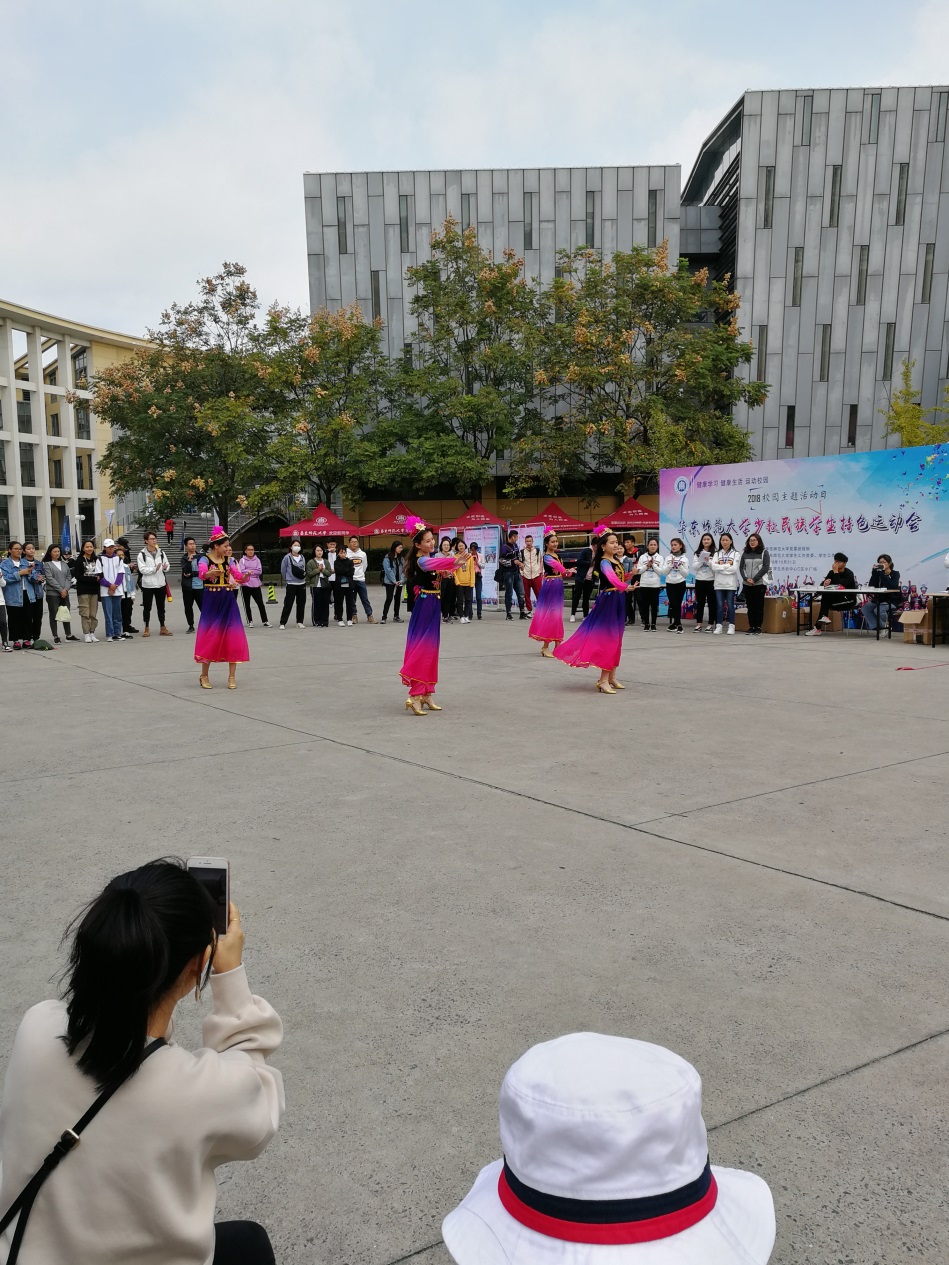 运动场上,随处可见介绍各民族特色体育运动的展板、身穿民族服装自信地展示民族文化的少数民族同学和辛劳组织活动的少数民族工作人员,场面热闹和谐;不少藏族同学组织其他各民族同学一起跳起了“锅庄舞”并对从未接触过该舞蹈的同学进行悉心指导,欢快的氛围很快就吸引了许多汉族同学前来参与体验,加入“锅庄舞”的同学也越来越多。