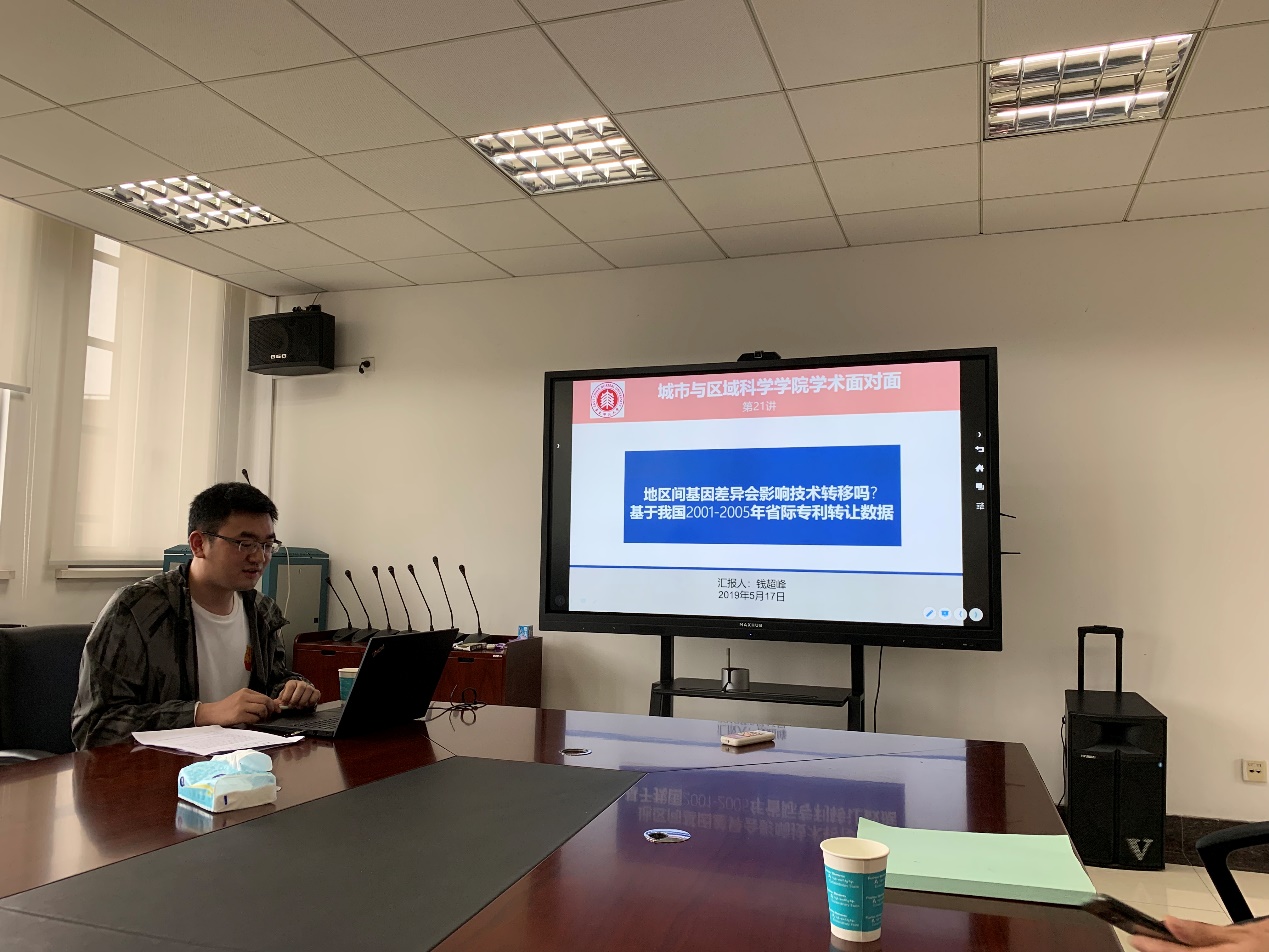 2019年4月17日14点40分,城市与区域科学学院第21次“学术面对面”活动在资环楼539会议室如期举行。2017级硕士研究生钱超峰同学作《地区间基因差异会影响技术转移吗?基于我国2001-2005年省际转让数据》的报告,滕堂伟老师进行总结点评。