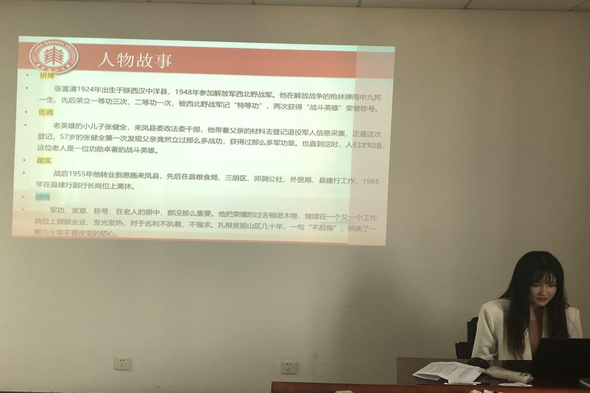 各个学习小组精心准备,运用丰富的材料,以形象生动的方式介绍了时代楷模的事迹以及小组成员在学习中的感悟和体会。黄静同学从驻村第一书记黄文秀同志的故事中学到了要在平凡的岗位上,不忘初心,砥砺奋斗,这是一名共产党员应该做的事情,黄文秀的精神值得每位党员学习。