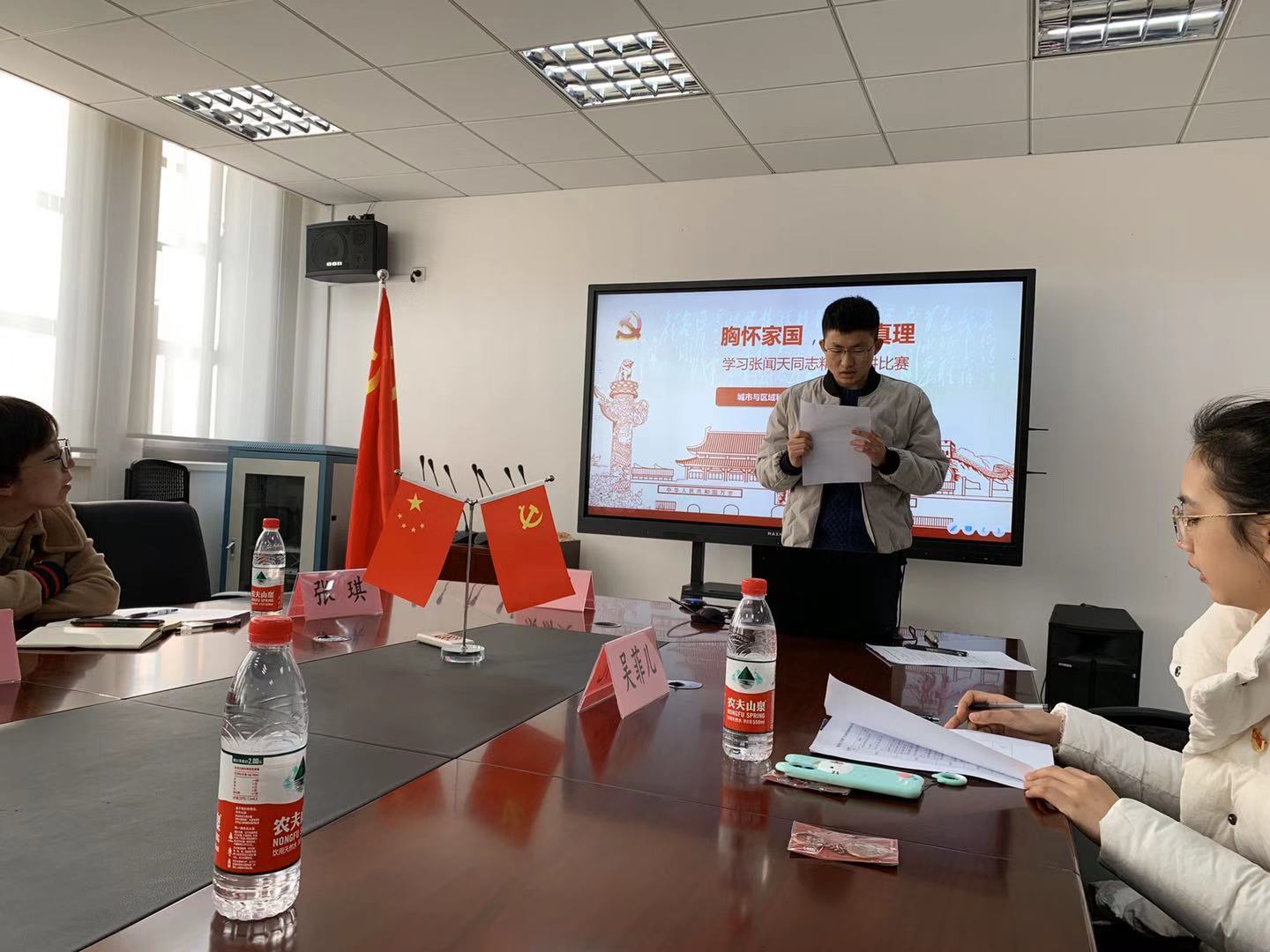 本次比赛是在各党小组自主学习后,推选一位组员上台进行演讲。五位演讲同学富有感情,激情饱满,把事迹与实际相结合,讲述了五个精彩故事,把闻天事迹娓娓道来,传达了自己对“闻天精神”的感悟。康译之同学用其生动优美的语言表达了自己对于张闻天深入农村开展调查的敬意,黄艺丹同学伴随着优美的音乐旋律,描述了张闻天同志的生平故事,用细节打动人心,从他的点滴生活中提炼“闻天精神”,崔莹雪同学立足自身发展,谈论了如何在日常的学习生活之中传承“闻天精神”,林铭亮同学讲述了地理人如何树立远大理想,从“生活的理想”走向“理想的生活”,陈鹏鑫同学从地理人全球视野的角度贯彻张闻天同志的爱国主义精神。