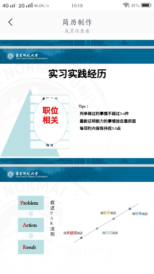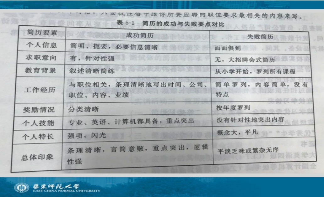 在活动中,朱老师首先介绍了一份简历的基本构成:首先,一份简历应该具备“个人资料”、“求职目标”、“教育(培训)背景”、“实习实践经验”、“技能特长”、“奖励与荣誉”等基本内容。其次,在撰写简历时要分清层次,理清顺序,突出重点和自身优势,并可适当对部分关键内容加以标注。最后,要避免内容重复,注意简洁。