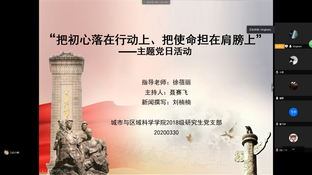 “生命重于泰山、疫情就是命令、防控就是责任”。为深入贯彻落实习近平总书记对新冠肺炎疫情防控的一系列重要指示精神,宣传贯彻上级党组织有关疫情防控的工作要求,2020年3月30日,城区学院2018级研究生党支部开展了以“把初心落在行动上、把使命担在肩膀上”为主题的主题党日,党支部全体党员参加,活动由支部组织委员聂赛飞主持。