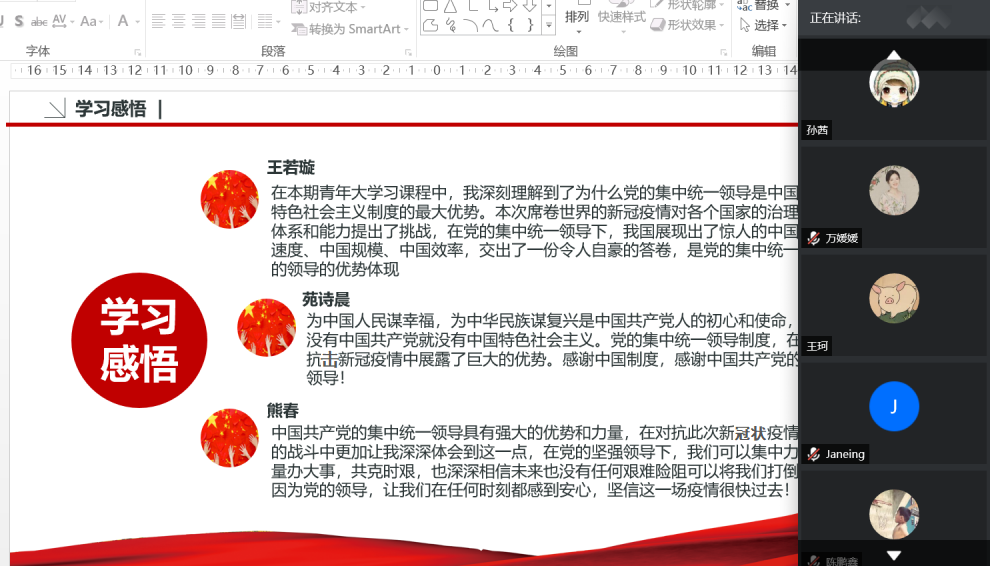 此次集体学习不仅对所学内容进行了检阅,同时结合疫情在家的学习与生活经历,团支部成员间进行交流与分享,使得此次集体学习变得更加生动和高效。各团支部代表为大家分享了自己的学习感悟。可以看出,本期主题团课的学习,广大团员青年对中国特色社会主义的本质特征以及中国特色社会主义制度的最大优势等重要问题有了较为明确的理解。同时,面对此次肺炎疫情,所显现的“中国速度”、“中国规模”、“中国担当”也使广大团员青年对战胜来势汹汹的肺炎疫情充满了自信。