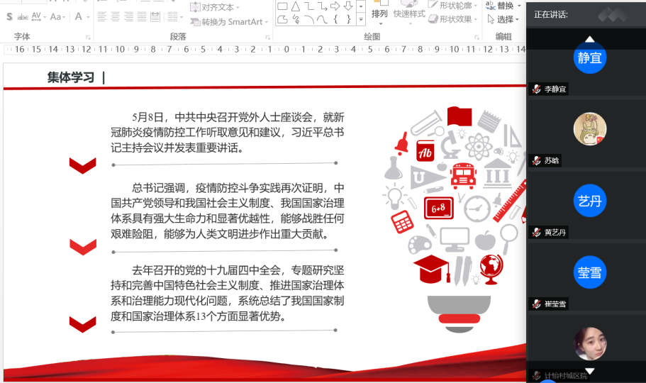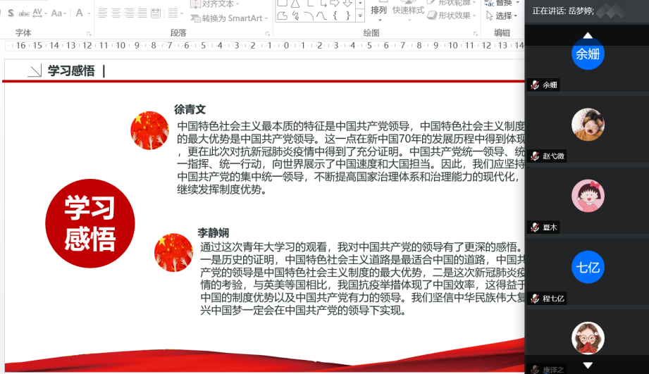 为强化学习效果,切实帮助广大团员青年树立制度自信,2020年5月14日下午,各团支部成员通过视频会议形式开展集体学习,对学习成果进行分享与总结。3个研究生团支部和1个本科生团支部近80名青年参与本次活动,活动由2019级研究生团支书岳梦婷主持。