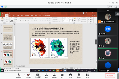 接着,各学习小组从自己的研究领域出发,分享自己对环境问题的关注。第一组由孙康领衔(组员:彭珏、万媛媛、史佳宁、谌丹华和陈鹏鑫)从两篇学术文章出发,向大家展示了长三角城市群绿色创新效率的格局,并基于此介绍了绿色创新对长三角一体化的一些政策启示。第二组由林铭亮负责(组员:崔蓬伟、吴劲草、何静红、刘爽和乐欢)从经济、制度、文化和社会四个方面讲述地理学对生态环境所做的努力。第三组由李静宜召集(组员:陈囿桦、余珊、王潇萌、计怡村、苏晗和周媛)向大家介绍中国填海造陆30年的发展,在展示中国强大基建能力的同时,为大家敲响警钟,提出警示:在追求经济利益的同时,也要关注生态环境的保护与建设。第四组共有岳梦婷,孙茜,洪萍,顾斐菲,黄艺丹和谌思邈六位成员,他们分别以《巴黎协定》、澳洲大火、水-能源-粮食系统、北极地区、宅中乡精准扶贫和空气环境规制为例进行讲述,加深了大家对人地和谐思想的认识。第五组由李亮协调 (组员:张之帆、崔莹雪、程雯雯、康译之和黄静),向大家介绍人地和谐的相关概念,再以美国农场主为例,展示人地和谐思想在实践中的体现,简明扼要地向大家论述了人地和谐的重要性。