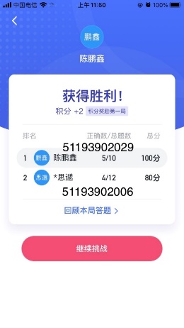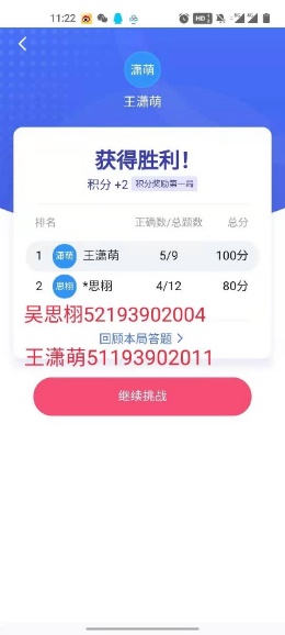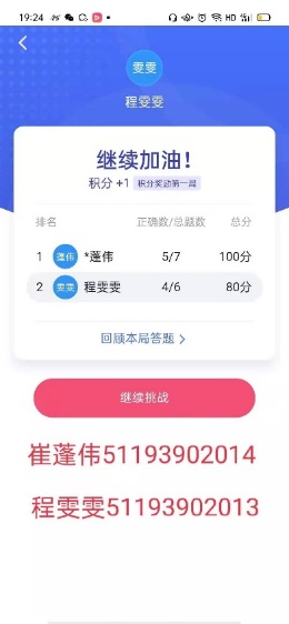 本次竞答初赛以线上方式开展,依托学习强国“双人对战”栏目进行。2019级团支部共有29位团员参与答题,其中党员17人、拟发展对象1人、入党积极分子11人。2020级支部共20人参与此次竞赛。顺利进入复赛的团队将参加“笔试复赛作答”。