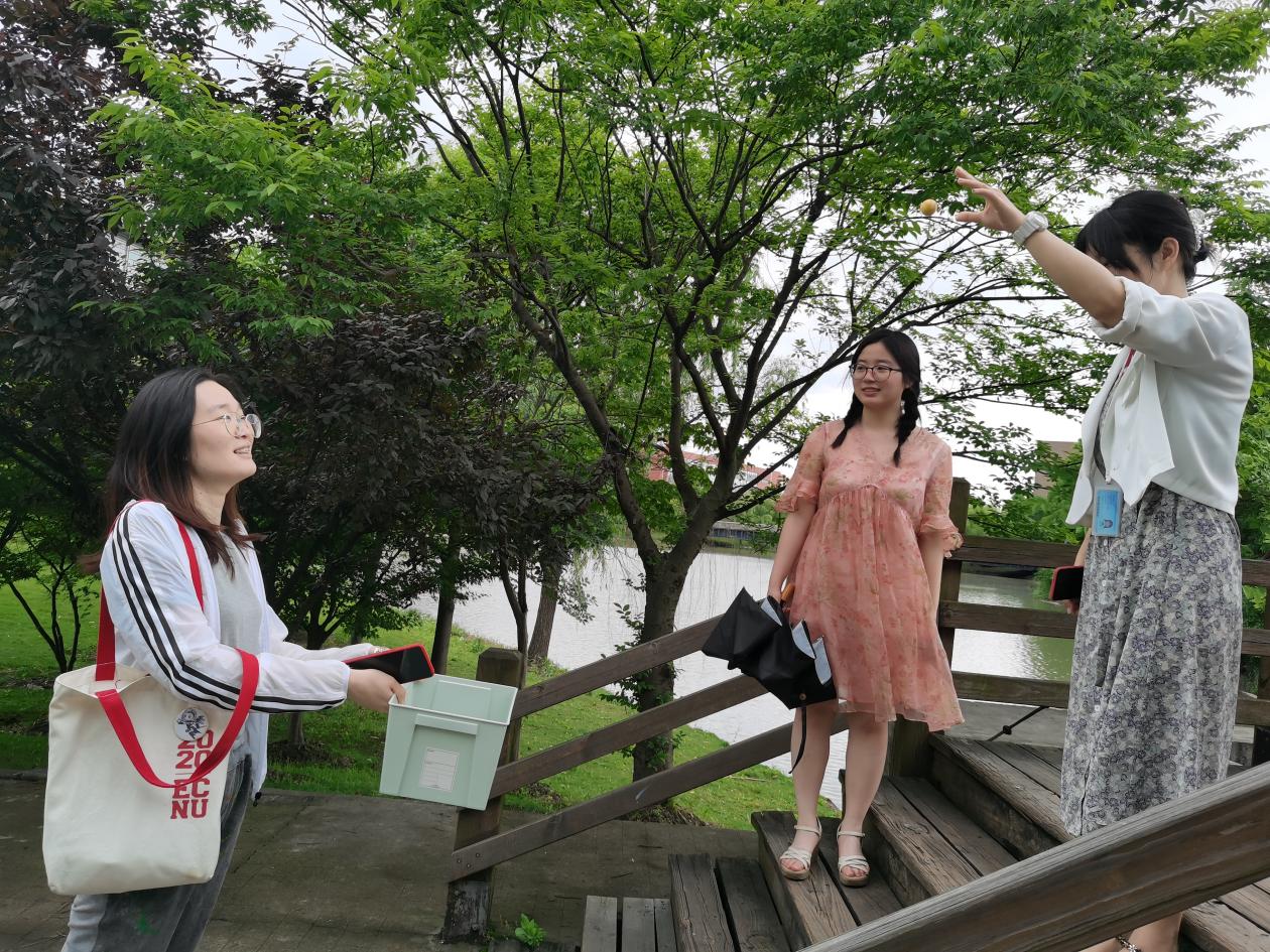 第三个任务点在生态岛的木桥上,一位队员站在桥上向下投球,一位队员站在下面用筐接球,这需要两位队员配合默契,其他成员也一起参与商讨投球和接球的技巧,合力完成任务,小伙伴们一起在木桥上欣赏了师大校园生意盎然的夏景。