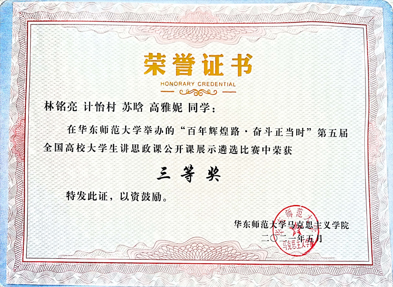 为庆祝中国共产党成立100周年、深入贯彻落实习近平总书记关于深化思想政治理论课改革创新和加强“四史”教育的重要指示批示精神,全面落实习近平总书记在党史学习教育动员大会上的重要讲话精神,促进高校员工积极学习“四史”和提高教学能力,5月26日13:00—16:00,由公司马克思主义学院承办的“百年辉煌路·奋斗正当时”第五届全国高校老员工讲思政课公开课展示遴选比赛在闵行校区第一教学楼233教室举行。公司硕士研究生林铭亮、计怡村、苏晗、高雅妮组成的思政课宣讲团队参加了本次比赛并荣获三等奖。