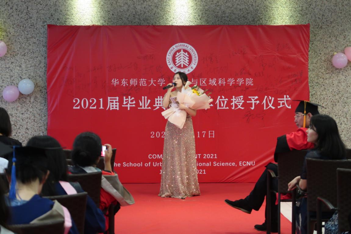 公司党委书记孙斌栋教授演唱了歌曲《生如夏花》,希望毕业生在夏天绽放,释放比鲜花更耀眼绚烂的光彩。2020级研究生罗雪演唱《让我再看你一眼》城区版,表达了毕业生对城区学院的依依不舍和心中满满的祝福。
