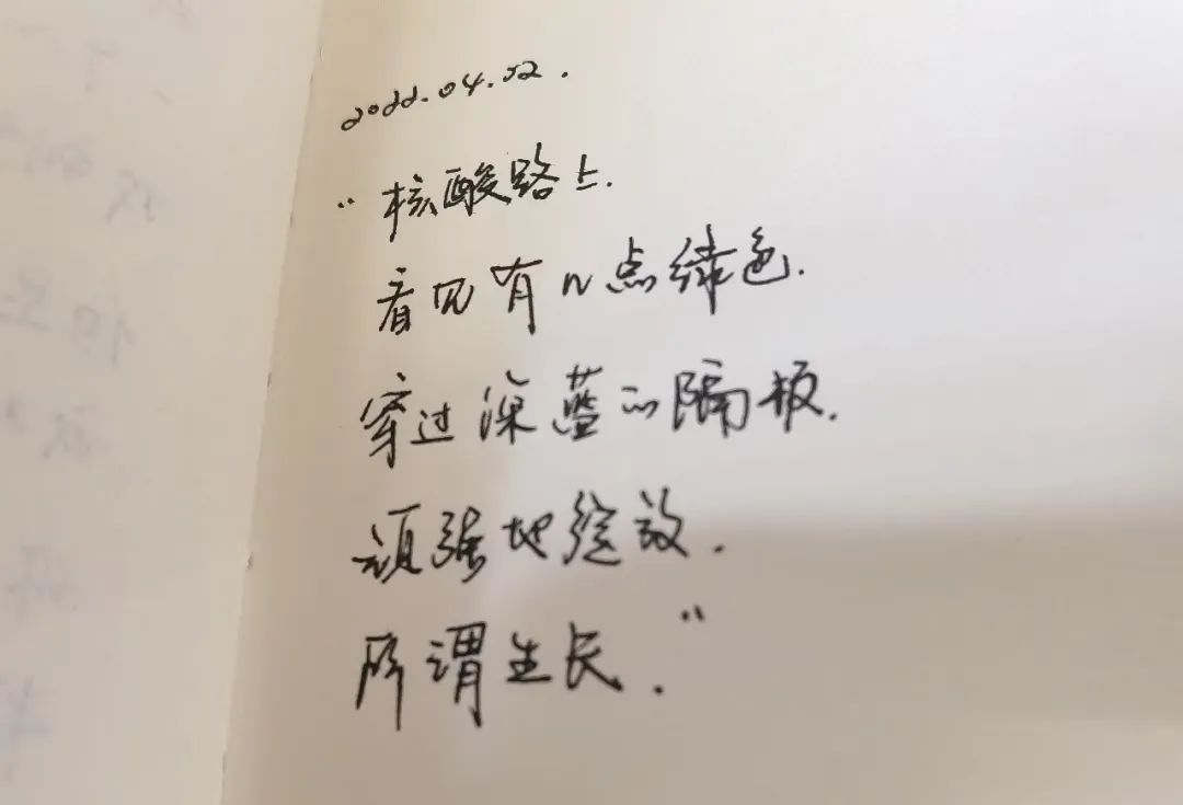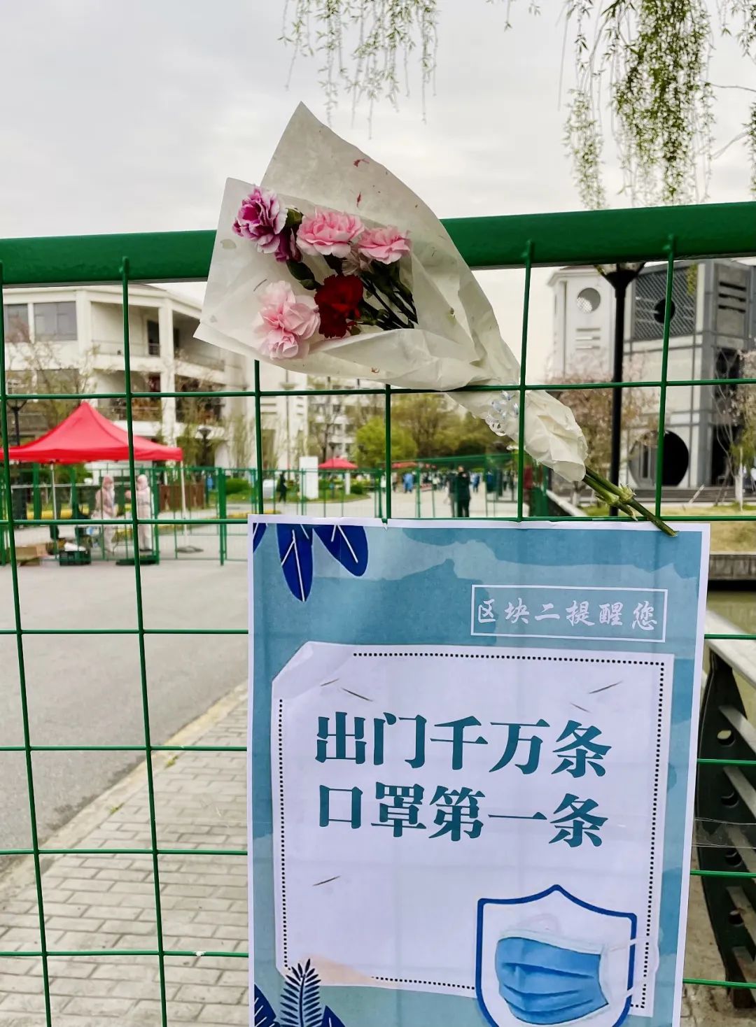 解读:4月5日,闵行校区本科生公寓区块二建起了铁栅栏,将河西与河东划分成了两个片区,栅栏后面的“大白”防疫志愿者正在值守工作,栅栏上贴着一副醒目的防疫标语“出门千万条,口罩第一条”,标语的上方摆放着一束盛开的鲜花,成为了春日里的一抹红。背景里的志愿者、栅栏上的防疫标语和盛开的鲜花,构成了疫情下校园里一道特殊的风景。疫情终将会过去,但浪漫永远不会消逝。”