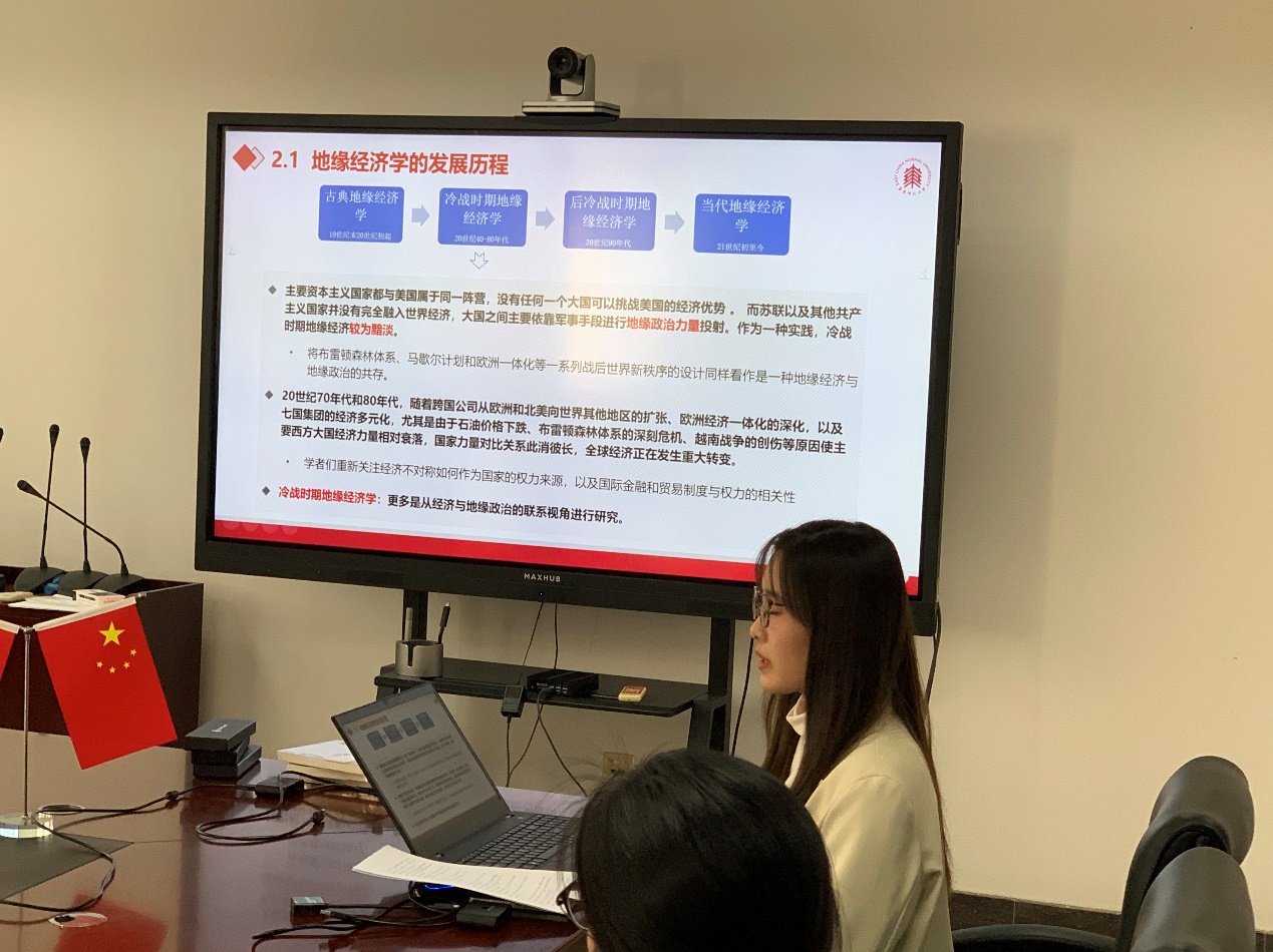 随后,毕诗瑶汇报了《理解西方地缘经济与地缘经济学》。汇报从地缘经济学的发展背景展开,介绍了其主要研究内容与不同流派,探究了地缘经济与地缘政治的关系与互动,以及三大时政研究议题,最后基于已有研究和中国面临时代背景的耦合性,提出不足与展望,以推动中国地缘经济学发展。毕诗瑶认为,地缘经济学的发展历程可以分为四个阶段,即古典地缘经济学、冷战时期地缘经济学、后冷战时期地缘经济学以及当代地缘经济学。在地缘经济学的发展中共形成了三大流派,即地缘战略流派、经济地理流派以及批判地理流派。她还指出,地缘经济与地缘政治之间存在着相互纠缠的关系,需要辩证统一的看待。在对目前研究不足的分析下,毕诗瑶提出,未来的研究需要建立不同尺度下地缘经济工具有效性分析框架,对地缘经济的韧性展开评估,分析小国、第三国在地缘经济中的地位与作用,并建立城市区域主义与地缘经济的关系。