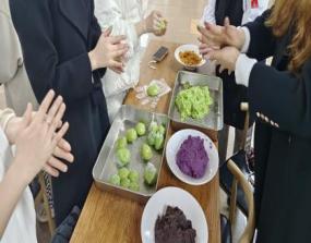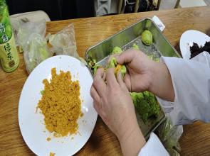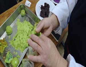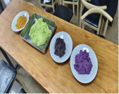 活动准备开始,掺有青汁的糯米皮、蛋黄肉松、豆沙和紫薯馅料等原料被分配在不同的餐桌。时间临近,同学们陆续到来,家乡天南海北,或许知道青团,或许此前从未听说,但此刻汇聚一堂,开始人生第一个青团。