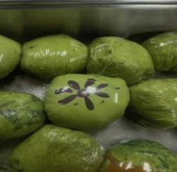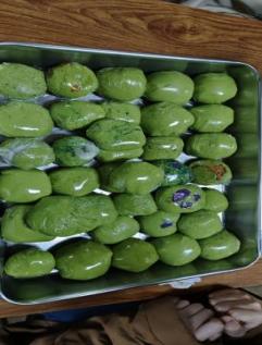 在几位心灵手巧的老师——食堂师傅的耐心教学下,同学们都跃跃欲试,戴好手套,挽起袖子,开启了亲手包青团之旅。拿起一团糯米皮用手慢慢地搓圆,再把搓好的青团用自己的大拇指按压下去,放上传统的豆沙馅,揉、搓、团、捏动作齐上阵,一个个身影忙得不亦乐乎。经过一番努力,一个个油绿如玉、清香扑鼻、Q弹绵软的青团呈现在眼前。为了定型和蒸煮,还为它裹上一层保鲜膜。