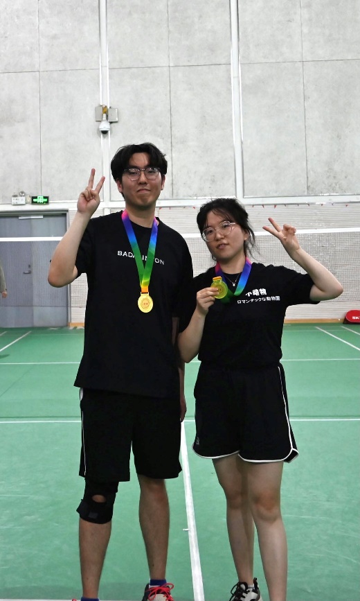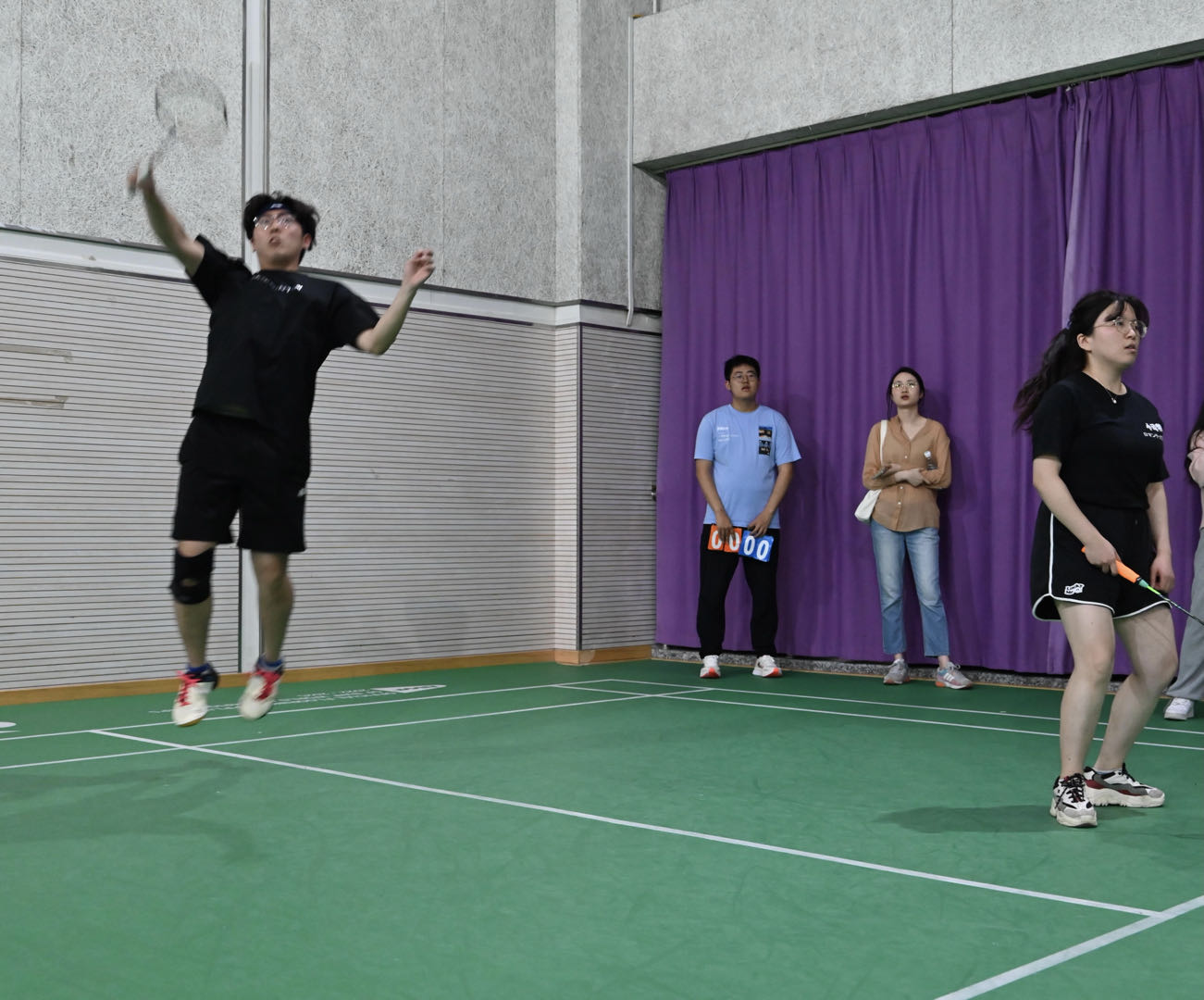 经过激烈角逐,最终迎来了比赛的最高潮,由何丹老师、谭亘奇组成的师生组合与朴俊先、王帮娟组成的混双组合展开了激烈的决赛。随着羽毛球在空中快速飞舞,场上对战双方积极跑动,不时打出漂亮的杀球引来场下观众的阵阵掌声。