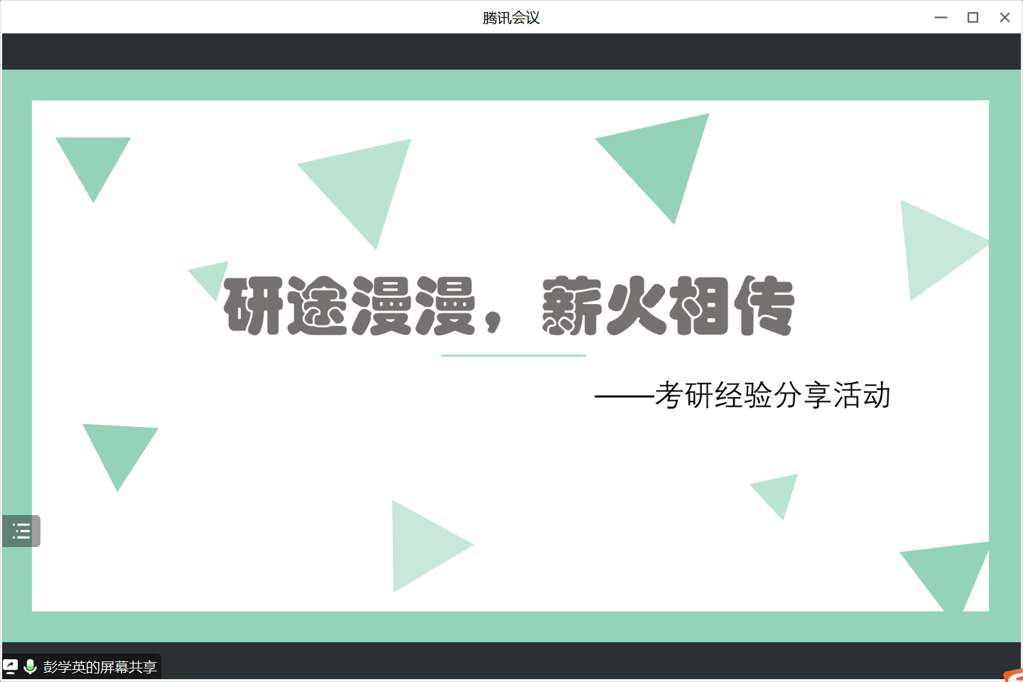 第三个环节是提问环节,与会同学针对考研纷纷提出自己的疑惑,进行分享的同学都耐心地给出了解答。最后主持人对此次活动进行简单总结并向分享者和参会同学致以谢意。