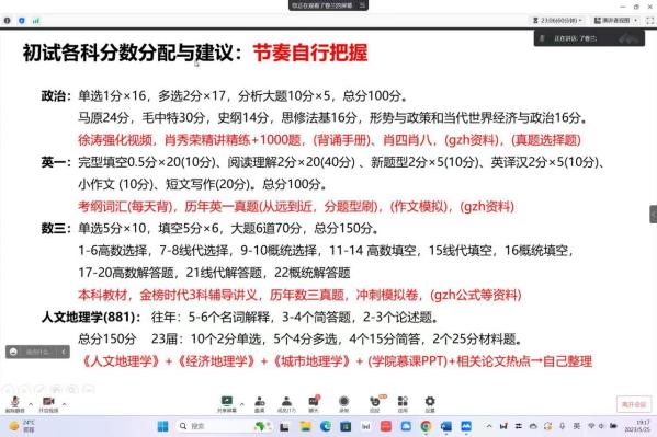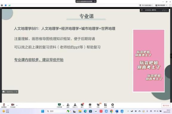 第二位是以第一名的成绩考取本校研究生的唐晖玥同学,首先,她分享了该如何进行考前准备,对于专业课,她介绍了人文地理学881的组成,建议画思维导图梳理知识框架,这样便于后期理解,同时由于专业课内容较多,她建议早点开始复习;接着,她分享了自己的备考方法,包括如何制定合理的学习计划、如何高效地记忆知识点等。