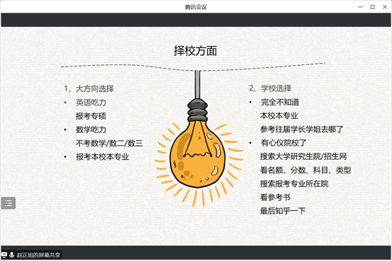 第一位是跨考南京大学地理系的赵正旭同学,他分享了择校方面的建议,从个人条件选择和学校选择两个方面展开,其中个人条件选择方面,他针对不同情况进行了建议,比如,如果在英语方面吃力,可以考虑报考专硕,如果数学不是很强,可以选取不考数学的专业方向;对于学校选择方面,可以通过搜索大学研究生院或者招生网,查看相关信息;接着,他分享了数学(二)、英语(一)和政治的备考方法和备考资料,比如,关于数学(二),推荐的资料有李永乐3套,李林6套等。