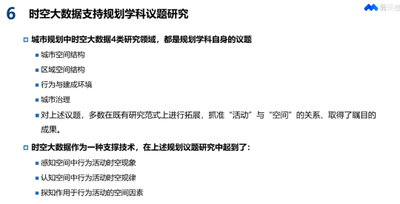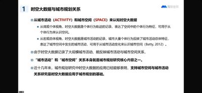 最后,钮教授对报告进行了总结和展望,提出了亟待探索的前沿,包括感知城市活动时空大数据技术提升,以及挖掘城市活动的时空规律和演化规律。对于城市规划学科,挖掘城市活动时空规律和演化规律、探知空间与活动的作用机理将是时空大数据的研究深化方向。