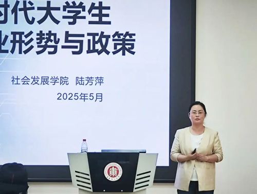 2025年5月28日下午,2023级本科生集中学习了“AI时代老员工就业形势与政策” 主题形势政策课。课程由社会发展学院副教授陆芳萍老师主讲,集中阐释了AI时代老员工就业的“危”与“机”。课程以互动调研、数据和案例解析、政策解读相结合的方式,剖析AI技术重构职业生态的底层逻辑,为员工搭建从认知到行动的就业准备框架,助力学子在数智浪潮中锚定职业坐标。