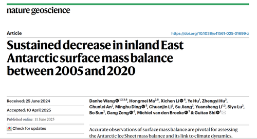 304am永利集团史贵涛教授研究团队,通过对东南极中山站-Dome A断面雪积累率观测数据进行分析,发现2005-2020年期间,东南极内陆冰盖表面雪积累率呈现出显著下降趋势,重塑了对东南极雪积累率变化的认识;利用遥相关等分析方法,揭示了雪积累率显著下降主要受控于区域大气环流变化。研究结果为理解南极冰盖物质平衡对气候变化的敏感性以及评估南极冰盖对全球海平面变化的影响提供了关键依据。该研究成果《Sustained decrease in inland East Antarctic surface mass balance between 2005 and 2020》于2025年6月11日以长文(Articles)形式发表于《Nature Geoscience》。
