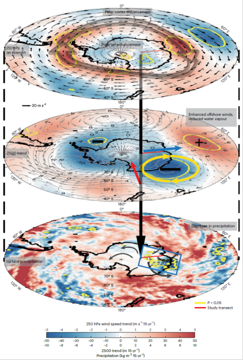 为解决上述问题,该研究利用沿东南极沿岸至冰盖最高点Dome A(约1250公里)断面设置的物质平衡标杆观测数据,研究了2005-2020年东南极冰盖表面雪积累率的变化特征。研究结果显示,2005 至 2020 年间,东南极内陆表面雪积累率呈现出显著下降趋势,15年间降低了约三分之一。研究表明,这一变化趋势主要与大气环流变化有关,具体表现为:对流层上层纬向环流增强和对流层中层离岸风加强,导致向南极内陆的水汽输入减少,进而引起降水量下降,最终导致雪积累率降低(如下图)。