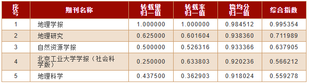 (1)期刊综合指数=0.4×转载量归一值+0.3×转载率归一值+0.3×篇均分归一值;