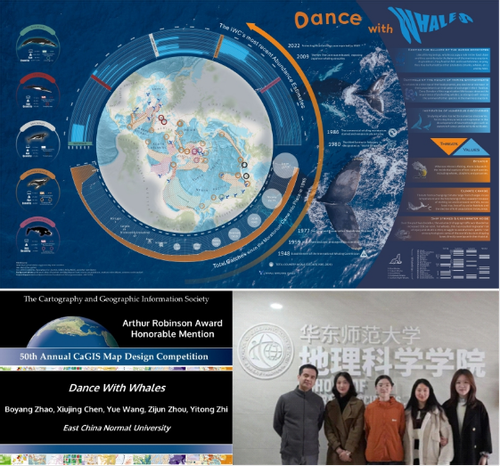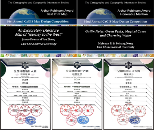 课程是播种耕耘,竞赛就是开花育果。2024年唐曦老师指导本科科创团队12人,指导本科生获得国内地图设计竞赛奖2项、社会实践项目优秀2项,新增本科生创新创业培育项目2项。特别是在首届“星湖杯”全国地图设计大赛员工组赛道中,指导本科生摘得“年度最佳专题地图”特等奖和“专题地图作品一等奖”,指导硕士生作品摘得“年度最佳创意地图”特等奖,华东师大特等奖占7项中2项,在全国高校名列前茅。此外,在CaGIS地图设计大赛中再度突破,指导的硕士首获“Winner of the Arthur Robinson Award for Best Printed Map”;指导的博士在首届长三角创意地图大赛获优胜奖。