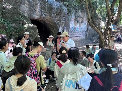 2025年7月2日上午,实习队伍赴玉皇山验证西湖复向斜次级构造。在紫来洞盘山公路侧翼,同学们通过测量玉皇山向斜核部周围的地层产状,进一步理解了玉皇山为典型向斜成山。来到紫来洞,老师带领同学们观察了洞口船山组与栖霞组灰岩界线,结合断层角砾岩、方解石脉及燧石条带的共生组合,现场对石笋、落水洞等喀斯特地貌成因进行了一番讨论。