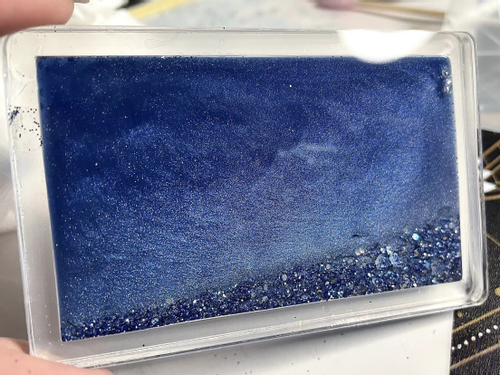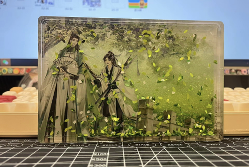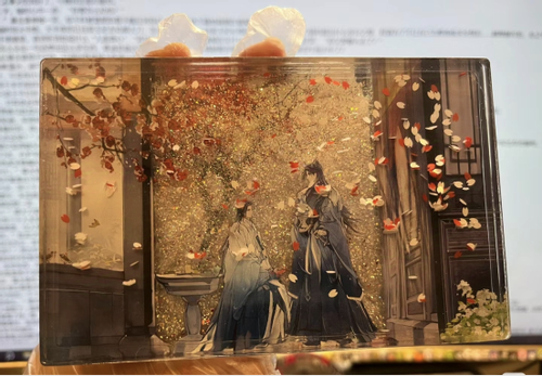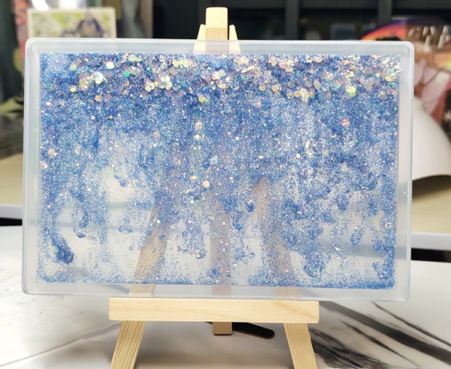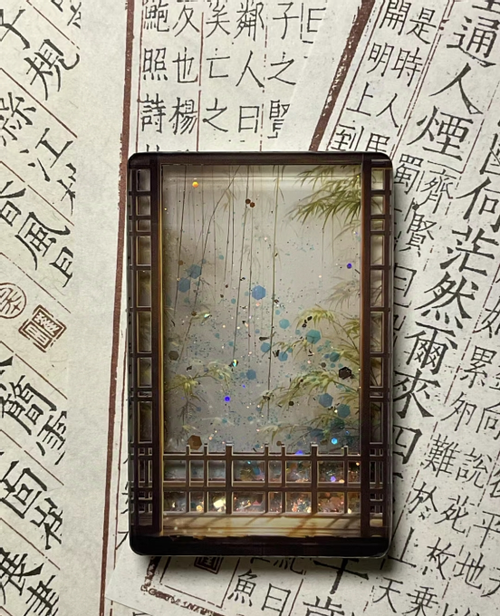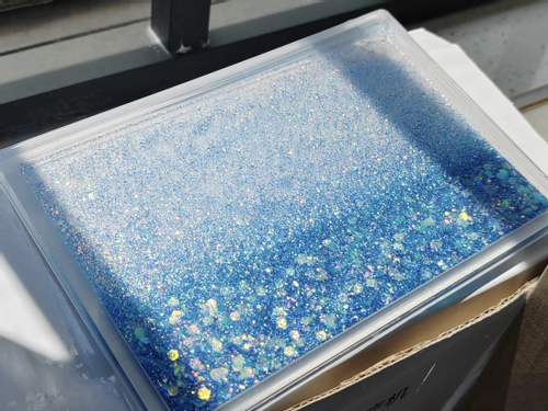流麻:流麻就是通过两片亚克力板夹住一个框形成空隙,在空隙中填充亮粉和流沙油。在晃动时,闪粉星星点点的反射十分璀璨。