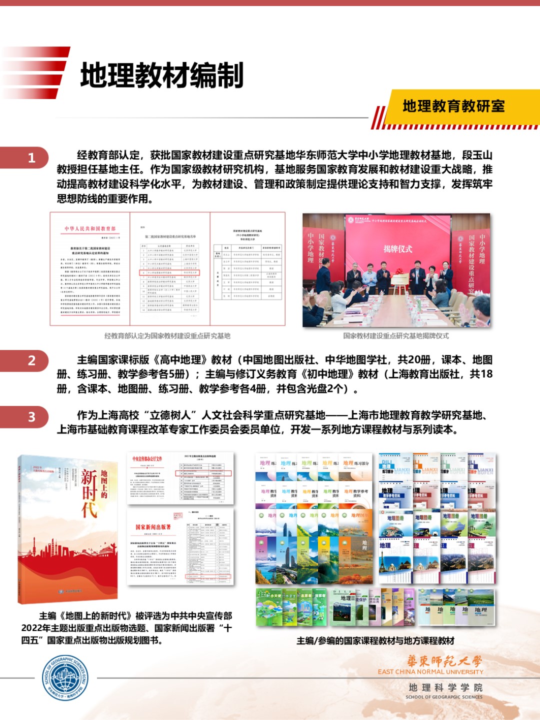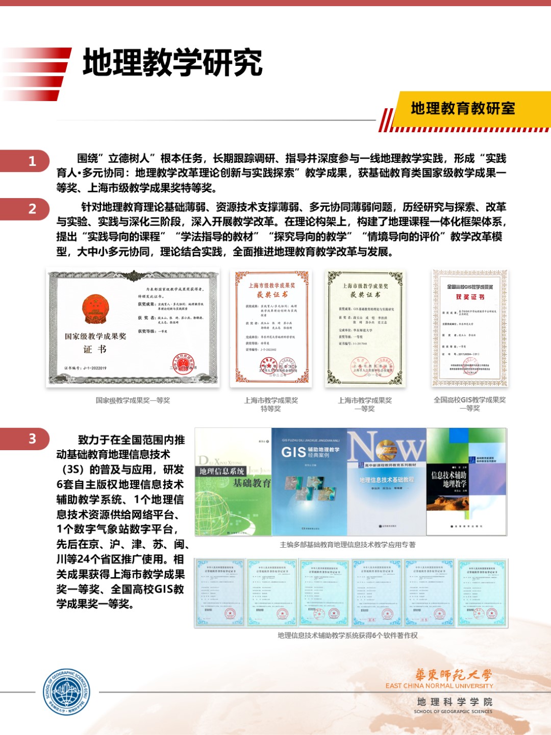 多年来,教研室取得了一系列教学改革成果,获得了国家级教学成果奖一等奖、国家精品资源共享课程、国家级一流本科课程、全国高校GIS教学成果奖一等奖、上海市基础公司产品成果特等奖等荣誉。在国内外发表教学成果论文300多篇,专著、译著、教材近百部。