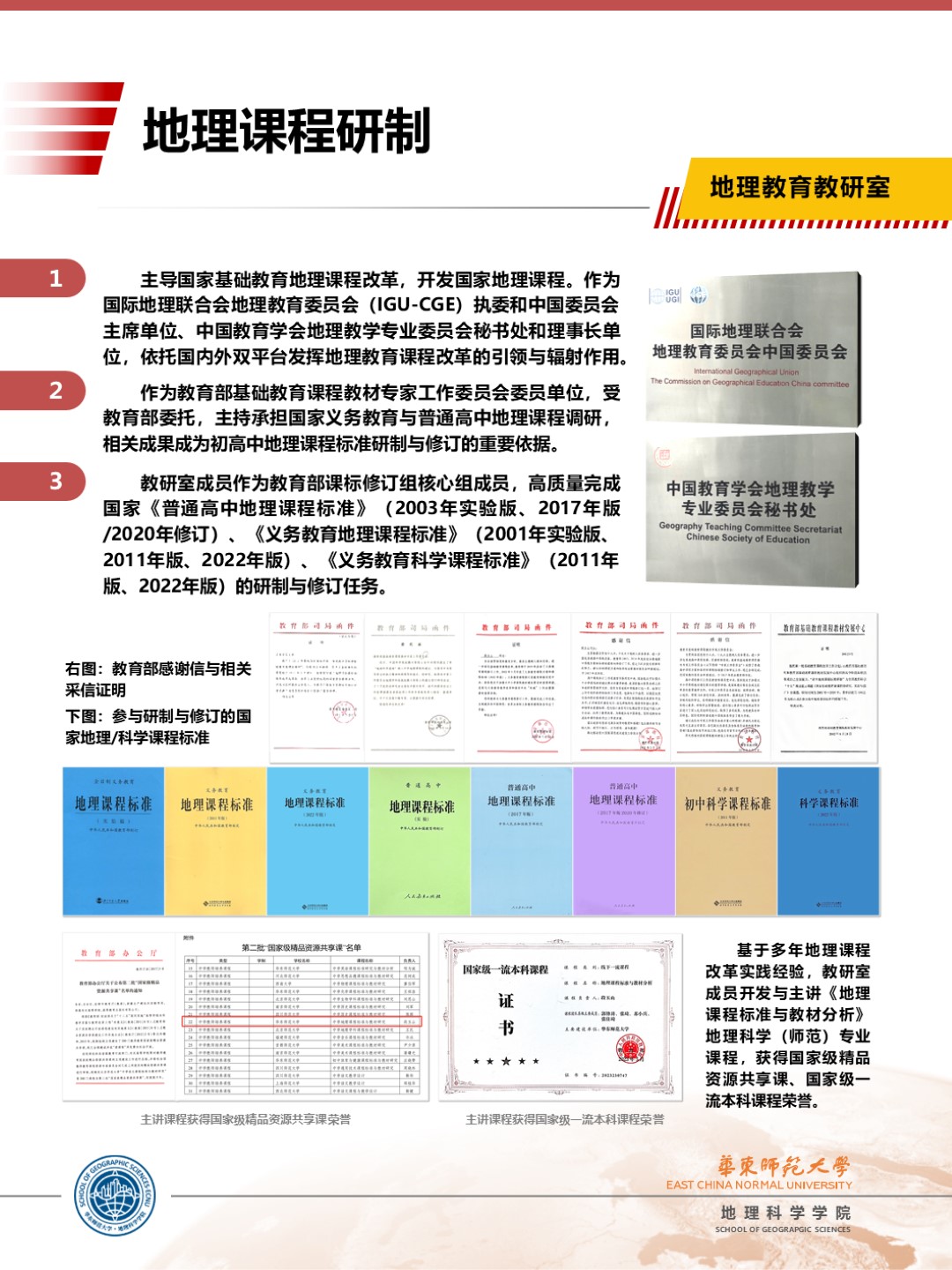 304am永利集团地理教育教研室是国际地理联合会-地理教育委员会(IGU-CGE)执委单位、中国委员会主席单位;教育部基础公司产品指导委员会地理专委会副主任单位;中国教育学会地理教学专业委员会理事长单位;教育部基础教育课程教材专家工作委员会委员单位;教育部高考考试内容改革专家工作委员会委员单位、中国地理学会理事单位、上海市地理学会副理事长兼秘书长单位、上海教育学会理事、地理教学专业委员会主任单位。