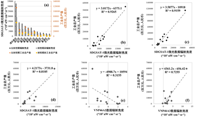图7 (a)疫情封控期间和非疫情期的工业总产值和夜间灯光辐射亮度变化;(b)疫情封控期间和(c)非疫情期工业总产值与SDGSAT-1微光数据辐射亮度的关系;工业总产值损失与(d)SDGSAT-1微光数据辐射亮度损失、(e)VNP46A2数据辐射亮度损失、(f)VNP46A3数据辐射亮度损失的关系。