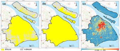 图5 上海通电区域识别结果。(a)基于SDGSAT-1微光数据,(b)基于Black Marble数据,(c)人口空间分布数据