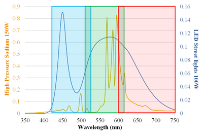 图3 LED和HPS灯的光谱响应曲线。图中的红、绿、蓝框分别表示SDGSAT-1 GLI的红、绿、蓝波段的光谱吸收范围。