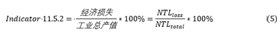 SDG指标11.5.2用于衡量灾害造成的直接经济损失与国内生产总值之比(公式(5))。本研究基于SDGSAT-1微光数据,评估了其在估计新冠肺炎疫情造成的经济损失方面的能力。采用2022年上海新冠肺炎疫情前后的SDGSAT-1微光数据辐射亮度变化来代表经济损失,计算了SDG指标11.5.2,并分析了辐射亮度变化与工业总产值的关系。