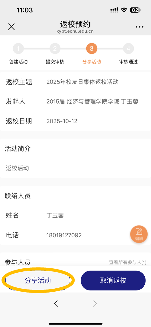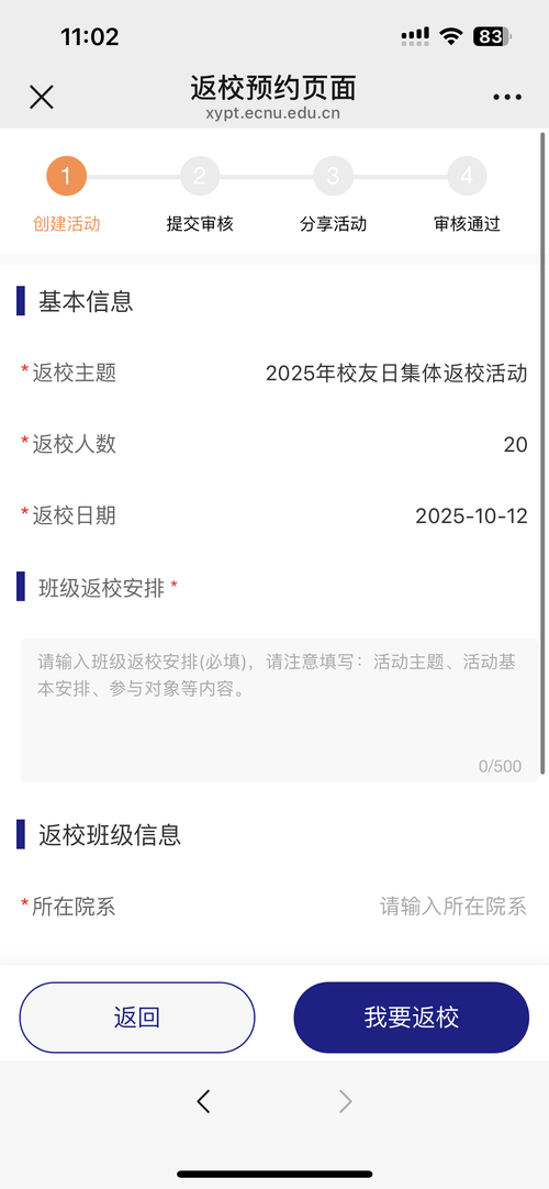 班级联络人点击“我要返校”,填写返校集体的相关信息,提交信息,等待后台审核。